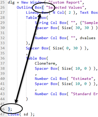 - On line 18, StringBox is not colored blue because it isn’t recognized by JSL as a function or object. Position the cursor between String and Box and simultaneously press the CTRL and Space keys (Option+Esc on the Mac). This displays the Autocomplete window using the string to the left of the cursor. Select String Col Box and delete the second Box.