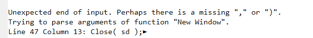 - Delete the close parenthesis on line 45 and run the script. The error message identifies the missing fence as the problem but indicates the last line of the script as its location.