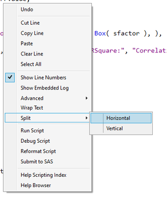 - Finally, its sometimes handy to split the script window so code in different parts of the script can be compared. To do this, right click and select Split > Horizontal or Split > Vertical.
