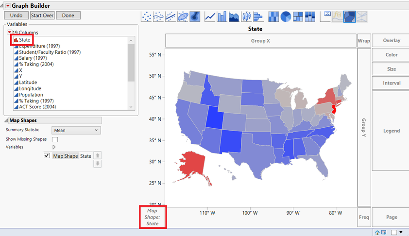 일반적으로 미국의 50개 주를 Map Shape에 드래그하면 다음과 같은 미국의 지형도를 자동으로 얻을 수 있었습니다.