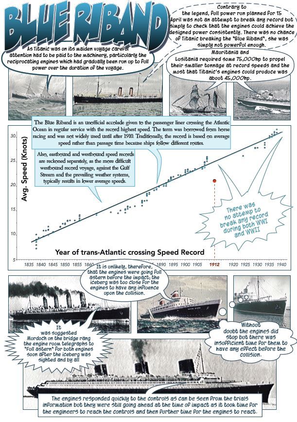 As Titanic was on its maiden voyage careful attention had to be paid to the machinery, particularly the reciprocating engines and these will have gradually been run up to full power over the duration of the voyage. The full power run planned for 15 April was not an attempt to break any record but simply to check that the engines could achieve the designed power consistently. There was no chance of Titanic breaking the "Blue Riband", she was simply not powerful enough. Mauritania and Lusitania required some 75,000hp to propel their smaller tonnage at record speeds and the most that Titanic’s engines could produce was about 45,000hp.