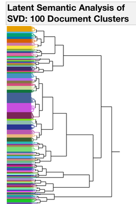 I started with Text Exploration. This is a word frequency (bag-of-words) approach to trying to understand what is in the documents. To group similar documents, I used a Singular Value Decomposition for a Latent Semantic Analysis (Latent Class Analysis or LCA). I centered and scaled the vectors and used TF-IDF weighting and then used a hierarchal clustering method to classify 100 clusters of documents. To find trends over time with each of the 100 clusters, I used a second rouind of clustering where I used the year as the attribute ID, LCA cluster as the object ID and clustered by the frequency of the LCA cluster. This hierarchal clustering approach finds groups of documents with the same frequency trends over time (Figures 2 and 3.)