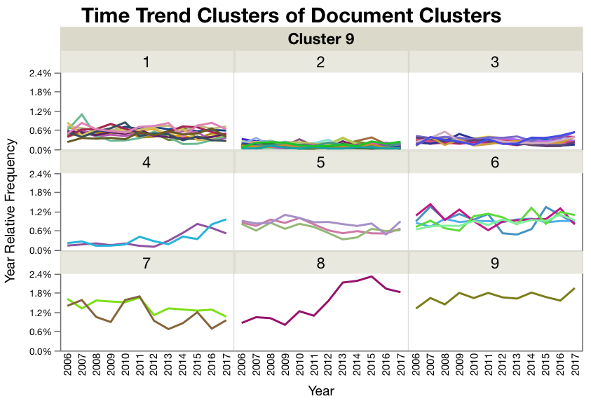 Figure 3. Document clusters within each time trend cluster. Most of the time trend clusters are pretty flat or have low frequencies like cluster 1 and 2. But clusters 3, 4, and 8 have some interesting upward trends in the last couple of years. (note the lines are colored by document cluster, and the color has nothing to do with cluster distance.)