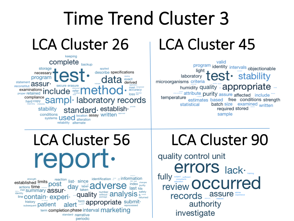 Figure 6. Time Trend Cluster 3. The time trend cluster with the smallest upward trends is cluster 3. Document clusters 26 and 45 are related to test methods and their general lack of robustness with respect to procedures, standards, sample handling, and their standards and controls. Document cluster 56 is related to citations around reporting things like adverse events at multiple stages of a drugs development and licensure. Finally, document cluster 90 is related to the lack of control of errors and how they were dealt with.