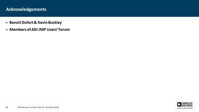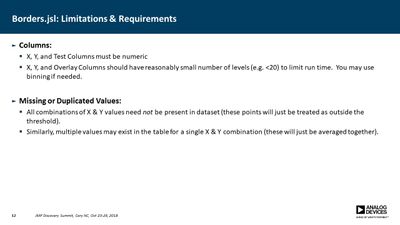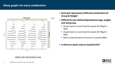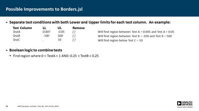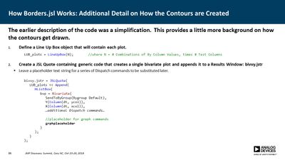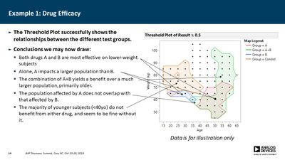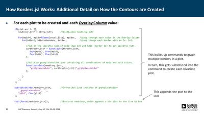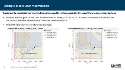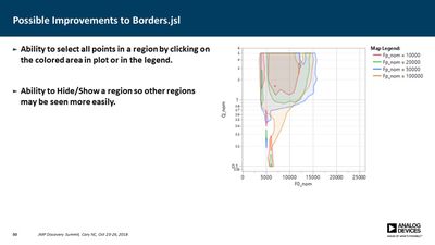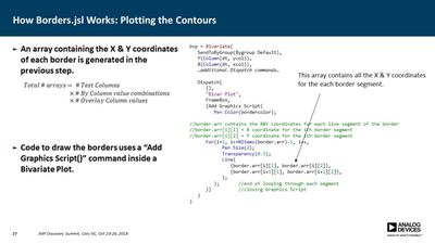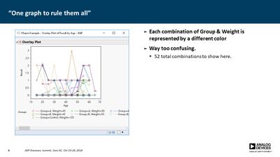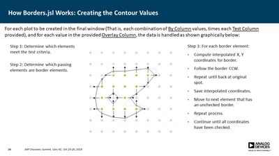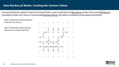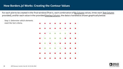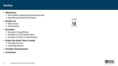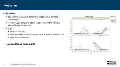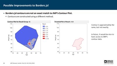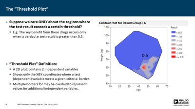Several JMP platforms exist for visualizing parameter spaces: Contour Plot, Overlay Plot, Surface Plot and Scatterplot 3D, to name a few. These work well when exploring data containing a single dependent variable as a function of two independent variables, but it is more difficult when one needs to explore data as a function of three independent variables (e.g., a three-factor DOE). Users must commonly resort to presenting multiple plots for all values of one or more of the parameters, making it difficult to discern important relationships. In many cases, however, the primary concern is simply knowing where the dependent variable exceeds a specific threshold. For example, under what conditions does the signal-to-noise ratio exceed unity? Or where in the parameter space is the p-value less than 0.05? In this presentation, a method is described for computing a single contour level from multiple plots and overlaying each into a single plot. This method employs a GUI-enabled JSL script to compute the contours, which are then plotted using the Graphics Scripting feature within the Bivariate Platform. The use of this method was essential in validation of a new measurement technique for our devices.