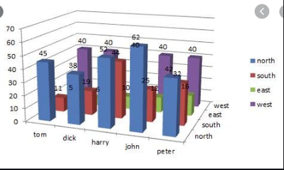 Short answer is no, because JMP only wants to present data in an accurate fashion. You really do not want a 3-D bar chart. Look closely at your 3-D bar chart. The bar in the front left has a height of 45. I know this because of the label on the top. But look over to the axis on the left. It shows that bar to be barely above 40. Compare Tom's west number to the back wall. It should be less than 40, but the value actually is 40. Further, what did Tom have in the east? For that matter, what about anybody in the east? 3-D bar charts add confusion, skew perspectives all for that 3rd dimension which does not provide any information. A better graph would be the following which is easily made in graph builder (I had to guess at some of the numbers from your table -- I couldn't see them!):