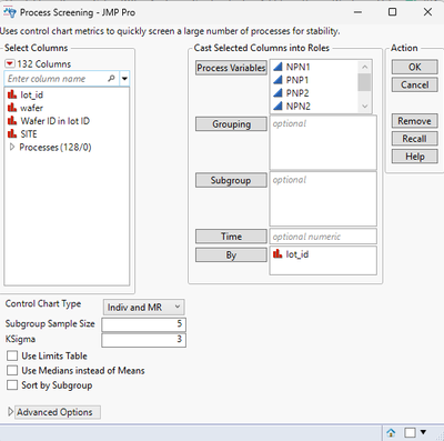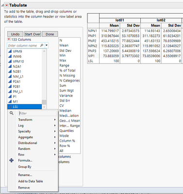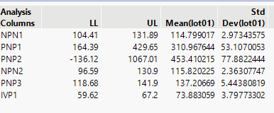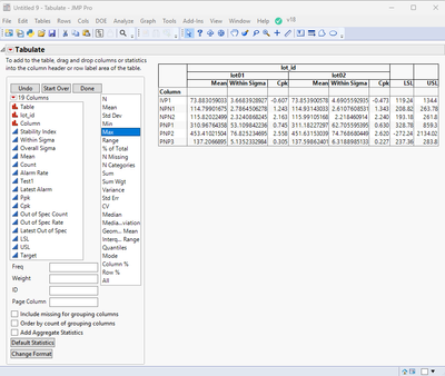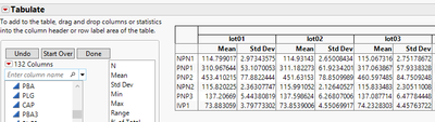 Column Table( Grouping Columns( :lot_id ), Statistics( Mean, Std Dev ) ),