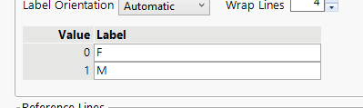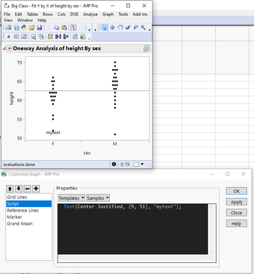 I would like to insert a text box to a one-way analysis chart where the x-axis column is character-based. The online, examples I see all use charts with a continuous numerical x-axis. From the Customize menu, I add my script line as shown in the example.