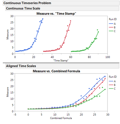 If the data shows long term trends with time you can use fit Y-by-X on each date/time test pair. Fit a spline to each graph and then save the spline equation. The columns can be combined in a new data table and each formula pointed at a common date/time column.
