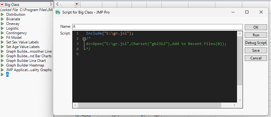 Eval(Parse("dt<<new script(\!"test\!", Include(\!"C:\gr.jsl\!"); );"))Thanks Experts!