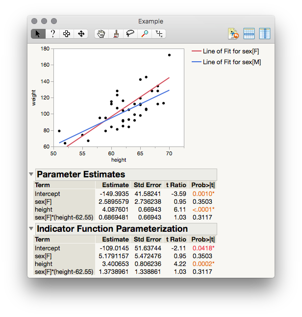 Now let's look at the Indicator Function table. The reported coefficient of height here will not be the average between men and women; rather, it will be the slope for just one level of your categorical factor. In this case, it will be the males, since M is after F and unless we set value ordering the last level alphabetically is used as the "control." So, we should expect to find as the coefficient for height in the Indicator Function Parameterization table the same value we just calculated, and indeed, 3.400653 is reported.