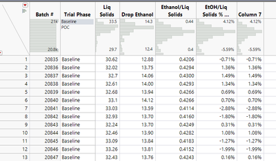 Presently to find this, I make a Tabulate table where I will use the Trial Phase column in the column zone and drop the calculated yield per batch (Ethanol/Liq Solids) into the drop zone for rows. Then using the average yield for Baseline from this table, I then make a new column where I calculate:
