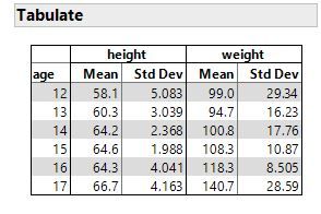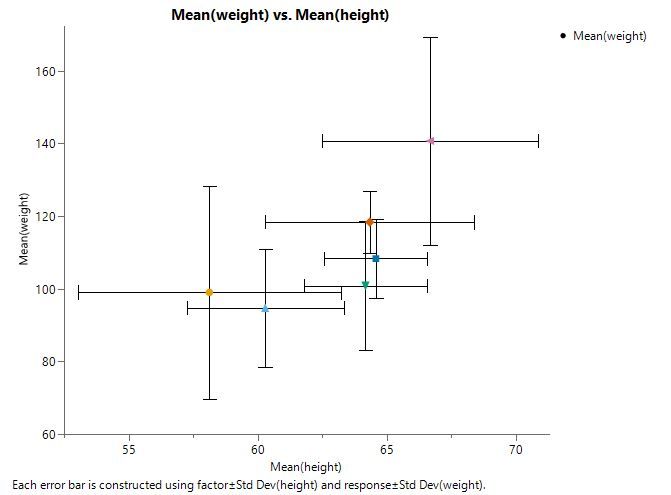- Start with a summarize table with these columns: group, mean for x variable, std. dev for x-axis, mean for y variable, std. dev. for y-axis. I used Big Class.jmp and tabulate to make the summarized table and then converted to a JMP Data Table.