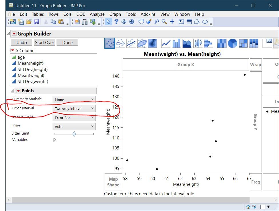 - Change the Error Interval (called Error Bars in JMP 14) to Two-way Interval