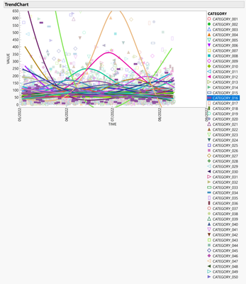 I believe that it is a pretty common situation when looking at a large number of trendlines (perhaps you have 50 tools all running the same process and are comparing defectivity vs. tool) that you'd want to be able to highlight a specific trend. The natural way of doing this is by selecting the trend in the legend, but this only emphasizes the points, not the lines. I've created a custom script that does this and I believe this is what the OP is asking about. Below is a comparison of my solution vs. a standard Row Legend behavior on some fake data.