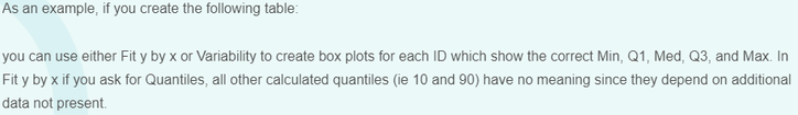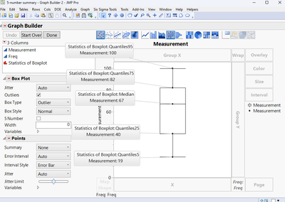 @Florian_Vogt Just trying to understand what the suggested in the solution (by @mpb ) on how to create a box plot when I have Min, Q1 (25%), Median, Q3 (75%) and Max values already calculated for each measurement on multiple parts. My data has three columns partID, Calculated 5 point summary (in the above order) and Measured Parameter Name.