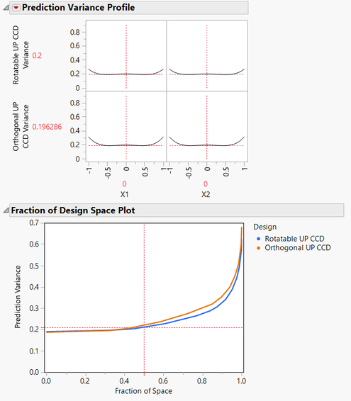 To illustrate, I created a 2 factor rotatable uniform precision CCD (5 center points) and a 2 factor orthogonal CCD with 5 center points. The ortogonal CCD will use a different axial distance. I then used the Compare Designs platform in JMP. Look at the prediction variance profile and fraction of design space plot. Although the designs are similar, the rotatable CCD performs better in terms of prediction variance.