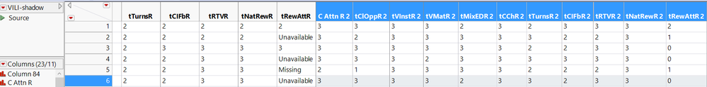 While I understand that Cohen's kappa is normally calculated between two raters who provide ratings in a 2x2 agreement table format, what I want to do is to calculate a measure of agreement between two groups of raters. The first group, highlighted here, provided ratings from a likert scale of 1-3 (0-3 for the last criteria) to 11 criteria "C Attn R, tCLOppR..." as indicated along the column headers. This scale corresponds to the frequency of a behavior, with 0=Unavailable, 1=not consistently used, 3=consistently used throughout the session.