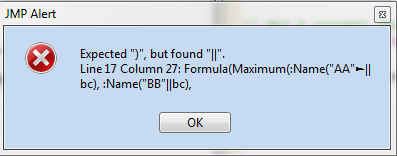The :Name() function requires quoted text, so there are quotes at the start and end by the parentheses. Next, we have the ^ ^ wrapped around your concatenation. Evalinsert processes that and the :Name() function is left with a quoted string of AA_140. EvalInsert will substitute everywhere something is wrapped in ^ ^. There is one special complication which is that our expression we are building needs to have quotes in it, but we have to use quotes to designate the string itself. To handle this, we can tell JMP each quotation mark is actually meant to be the quote character (rather than a part of JMP syntax) by prepending each quote with \! (slash-bang) or do as I have done below and put \[ after the starting quote, and ]\ before the final quote. This "escapes" all the quotes in the expression we are building.
