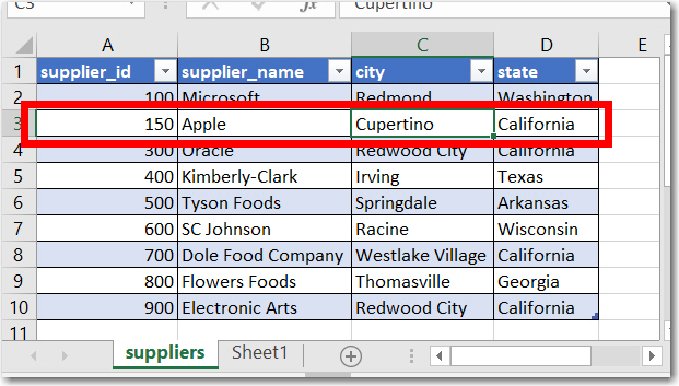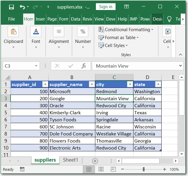 Below is a picture of a simple Excel file with two sheets and with formatting. The file is called suppliers.xlsx and the sheet to be updated is named suppliers. The book JSL Companion, 2nd Edition, documents three JMP ODBC methods: Open Database(), New SQL Query() and one the authors named a 3-step method.