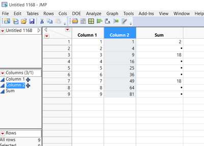 The answer is yes.  JMP has many functions that you can invoke for summing rows, columns, etc.  It is is little different if you want to, for example, add cells that are in different rows but it still can be done.  In the simple example below, I created Column 1 as a list 1 through 9.