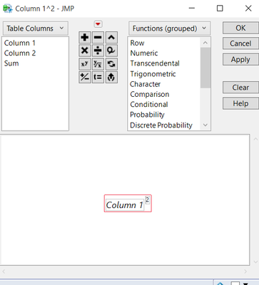 Then I used one of the many built-in functions available in the Formula Editor to square Column 1.