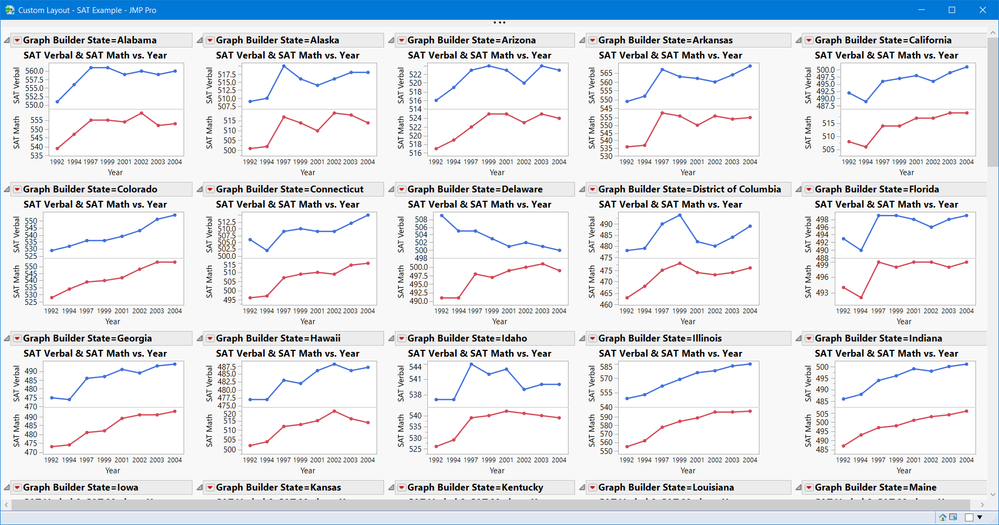 A JMP display box, called a LineUpBox, is the object that allows reorganizing the layout for the Distribution report. So until GraphBuilder has the feature Jeff Perkinson suggested you request, you can do this with a script. Below is a screen shot of a 5 column layout for the SATByYear.jmp data table  witha GraphBuilder plot for each state.