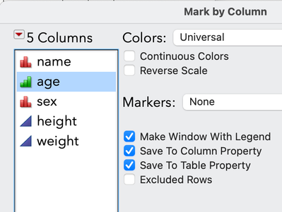 HOWEVER!!, even though the color is set for the column, the rings (as well as pretty much every graphical element in the Fit Y by X platform) ignores this, so coloring of boxes, rings, diamonds etc, all has to be done manually, one at a time, for every single graph you make.