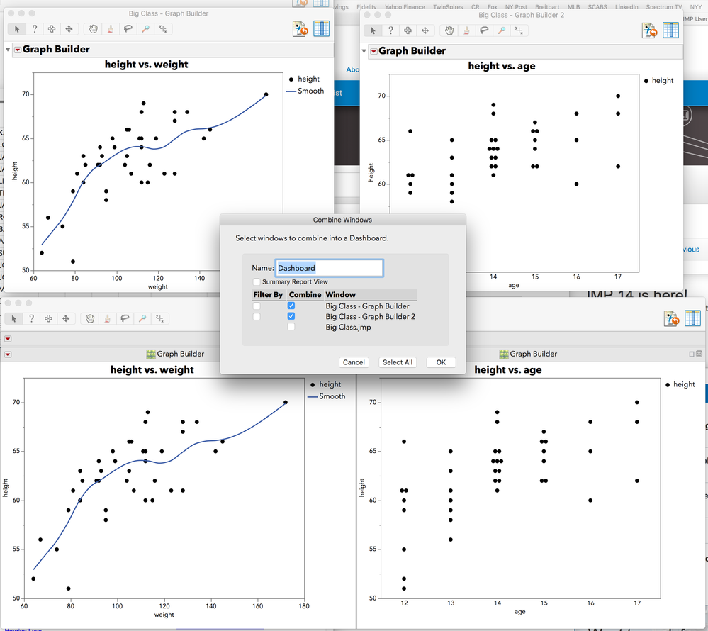 If you want to "combine" two graph builder graphs by overlaying one on the other, then you can do that by right-clicking in one graph, choosing Copy Frame Contents (under edit), and then Paste Frame Contents into the other graph builder window. Of course, if this is what you want, make sure that the graph windows are the same size with the same scales, etc.