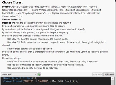 Choose Closest(:Strings, samples, Max Edit Count(9999)) // Col Max(Length(:Strings))