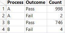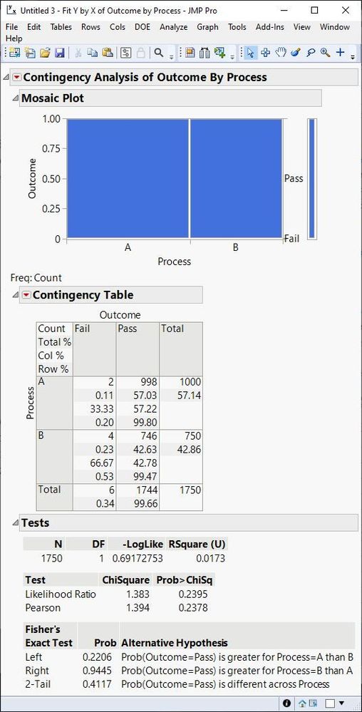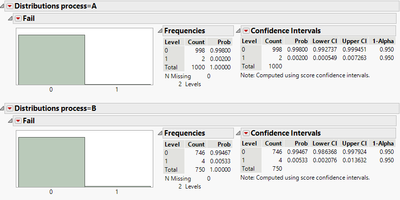 Process A has 2 fails out of 1000 units and Process B has 4 fails out of 750 units. Point estimates of failure rate are 2/1000 = 0.002 and 4/750 = 0.005 for Process A and B, respectively. How can I use JMP to prove statistical significance of failure rate difference? How do I setup the data table for that? How to put confidence interval around those failure rate estimates to check if intervals are overlapping or not?