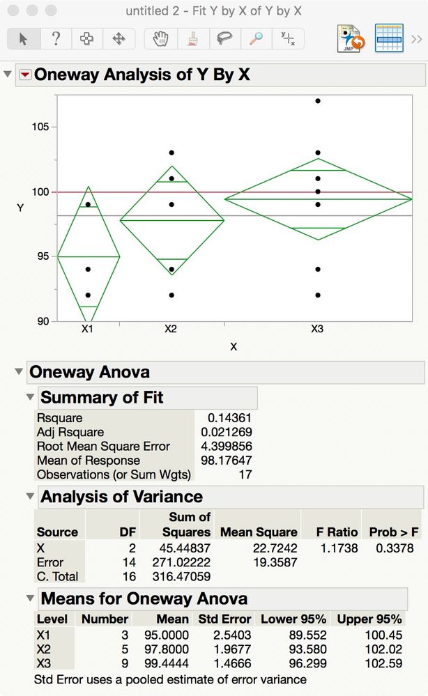 Here is the Oneway platform with a reference line for the gold standard and the results for ANOVA: