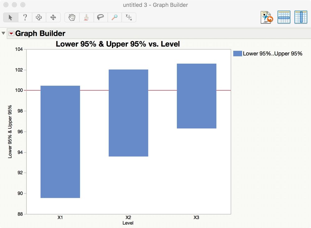 Now you compare the confidence interval for each sample. You can plot them in Graph Builder, too. Right-click on the Means for Oneway Anova table and select Make Into Data Table. It might look like this: