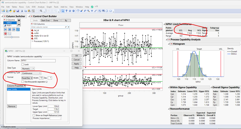 I want to build an X-bar chart for data on the thickness of tablets over 20 intervals (200 measurements). The specification limits are 3.0-3.5 mm. JMP calculated very narrow control limits for me, which are 3.28 and 3.35. In rounding these numbers, the limits become 3.3-3.3. I am interested in having only one decimal place, and I see through JMP's calculations that it does not consider significant figures. What can be done about this issue?