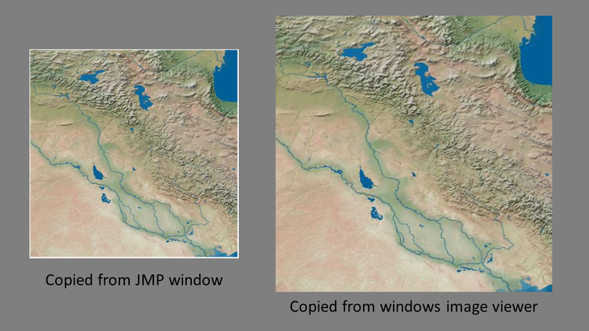 As part of a report-making tool I'm pulling a series of images from a zip file into a grid for easy viewing. I have that working as intended, but I'd also like the ability to click on an image to view it at full-size and copy the full-size image to the clipboard (to paste into PPT, etc). I've found this other thread where someone had a similar issue and I've repurposed that script. However, I've noticed some undesirable behavior with the copy picture message. Even though the image properties in the image box say it is 451x451 px just like the original file, copying that image to the clipboard (via JSL or by right-click) results in a smaller image than if I copy the file location directly, and JMP also has added an uneven white boarder.