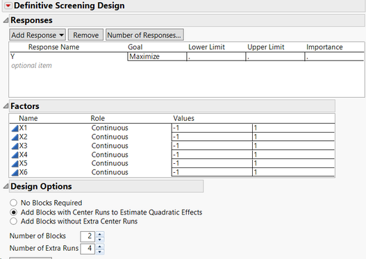 I've created a DSD DOE - 6 parameters with added blocks with center runs to estimate quadratic effects, in total of 18 runs.