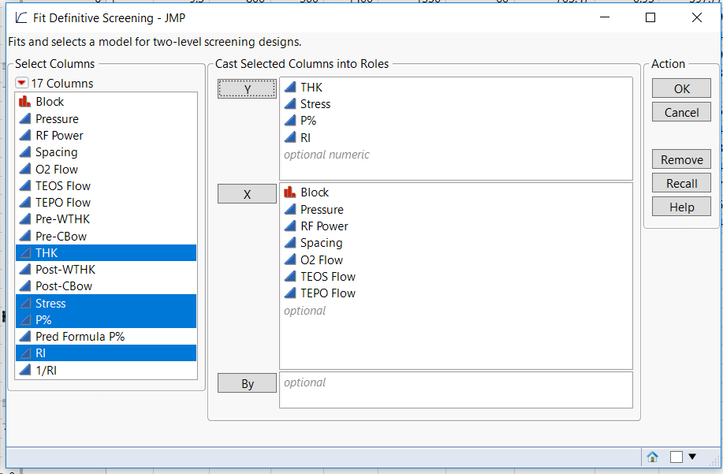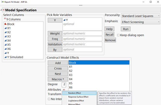 After running the Fit Definitive Screening analysis you can click Make Model to bring up the Fit Model dialog with the selected effects. At this point you should add the block as a random effect (see screenshot): Select Block > Attributes red triangle menu > Random Effect. The Method will default to the recommended REML.