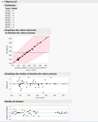 And to add to @statman's questions, how many overall runs were conducted? Why would you put a1*a2 in the model when you never had a1 and a2 in the same blend? Is JMP even analyzing this as a mixture? I'm not sure it is, but you need to check by looking at the Analysis of Variance table and seeing the message: Tested against reduced model Y=mean. The model for p2 might look good, but it is clearly an overspecified model, so you are likely overfitting. That means the model would not predict future observations very well. Anytime your parameter estimates contain the words "Zeroed" and "Biased", JMP is automatically removing terms from the model for you in order to get any results. There is no guarantee that the correct terms were removed. Therefore, you should never trust the results when you see those words in your parameter estimates table.