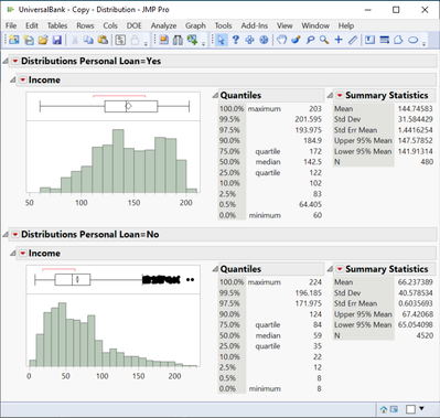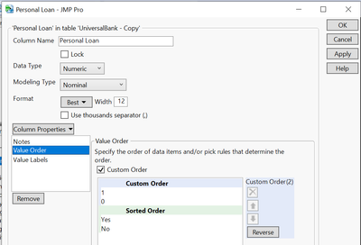 Hello! I've been teaching logistic regression with the Universal Bank data set for years but am getting different results this semester. The target variable, Personal Loan, has value ordering on it to specify that "Yes" is the class of interest. In the past, this was necessary to get the parameter estimates to show up relative to the "Yes" class. For instance, Income has a positive relationship to loan acceptance so it should have a positive coefficient. However, this semester, the parameter estimates are being displayed relative to the "No" class, which seems backwards compared to the value ordering. If I remove the value ordering property from Personal Loan, then the model results show up relative to the "Yes" class. Did something change in JMP 16? My specific version is JMP® Pro 16.1.0 (539038). Below are some screen shots of a simple example to show what's happening. Thanks!