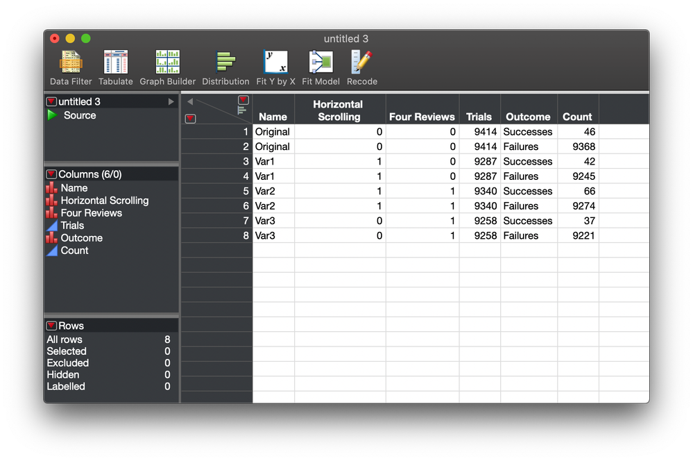The two factors are categorical so make sure that they use the nominal modeling type. The data table looks like this now.