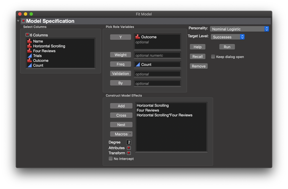 I left the nominal logistic regression choice for the fitting personality but at this point you could select GenReg or GLM with the binomial distribution and the login link function.