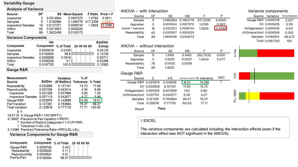 Good luck, I love the community here and it seems some good detective work has been completed to compare all the methods. A significant interaction effect means the MSA fails anyway. We would never want the measurement of the part to depend on who took the measurement. So if the difference between JMP and Minitab is only caused with a significant interaction effect, then it doesn't matter what the p-value or sum of squares numbers are. MSA fails, end of story. Do some improvements to the method so we get the same results from all operators and then redo the MSA to confirm it now passes without a significant interaction.
