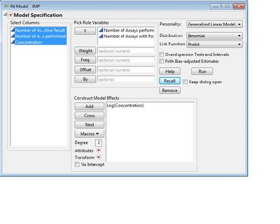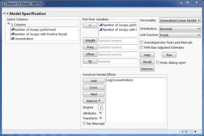 I am trying to reproduce a simple dose response analysis that I had performed in SPSS. So in JMP i am using the "Fit model" module, selecting for Generalized linear models, binomial distribution and probit link.