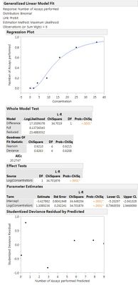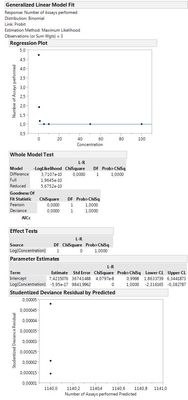 I select number of assays performed as "Y" variable, number of assays with positive result as "Freq" and concentration in logs as variable to model effects on. But when I hit run I get this message in the results: