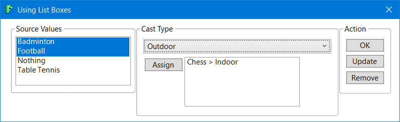 • Assigments are made by selections from the source list, the current category in the ComboBox and pressing the Assign button