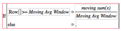 This takes advantage of the speed of the matrix operation. The subscript of the Current column in this formula is a matrix of the row numbers from the start of the moving average window to the current row number. My subscripting the column this way JMP returns a matrix and the Sum function is relatively efficient over a matrix.