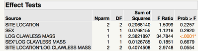 X Mass + Site location + sex + Mass*Sex + Mass*Site location