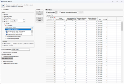 You should be able to do this using the Subset platform, Tables > Subset. After you select the Random type you want, e.g. random fraction of the data table, or random selection of a fixed number of rows, you can select the Stratify box and then select the Columns of interest that you want to stratify on -- perhaps a response variable, or just your input variables. When you stratify, JMP tries to make a subset that has the same distribution, mean, standard deviation, etc., so that you're viewing a representative subset of all your data.