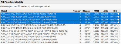 The "Stepwise" selection approach is different, more oriented like a "model-agnostic" analysis, where the selection of the terms do not necessarily follow some of the DoE principles (even if you can "lock" some terms like main effects to respect effect heredity/hierarchy), but is focussed on optimizing a criterion (AICc, BIC, ...). This can result in more complex models, as the "safeguards" from other platforms like "Fit DSD" may not be present. If you want to really push the boundaries and explore other designs with the Stepwise platform, you can also click on the red triangle, and try "All Possible Models". You can specify the number of terms in the model, and JMP will try all possible combinations of terms to provide all possible models with the number of terms specified. It can give you some "inspiration" in the modeling, but the results should be taken with caution, as some terms may be entered in the model without any statistical significance (so a little bit of fine-tuning might be needed after) :