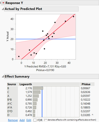 - In a first round, the Fit DSD platform tries to find the significant main effects, and create a model based on the identified main effects.